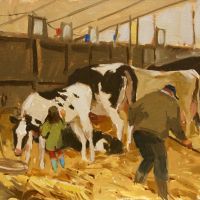 Artist Susanna Heath, Sarah painting cows, Gunton saw mill and deer park , Norfolk, Oil, 6x12in,