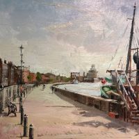 Artist Jack Godfrey, The Kelzerberg makes ready to sail, Great Yarmouth, Norfolk, Oil, x30cm,