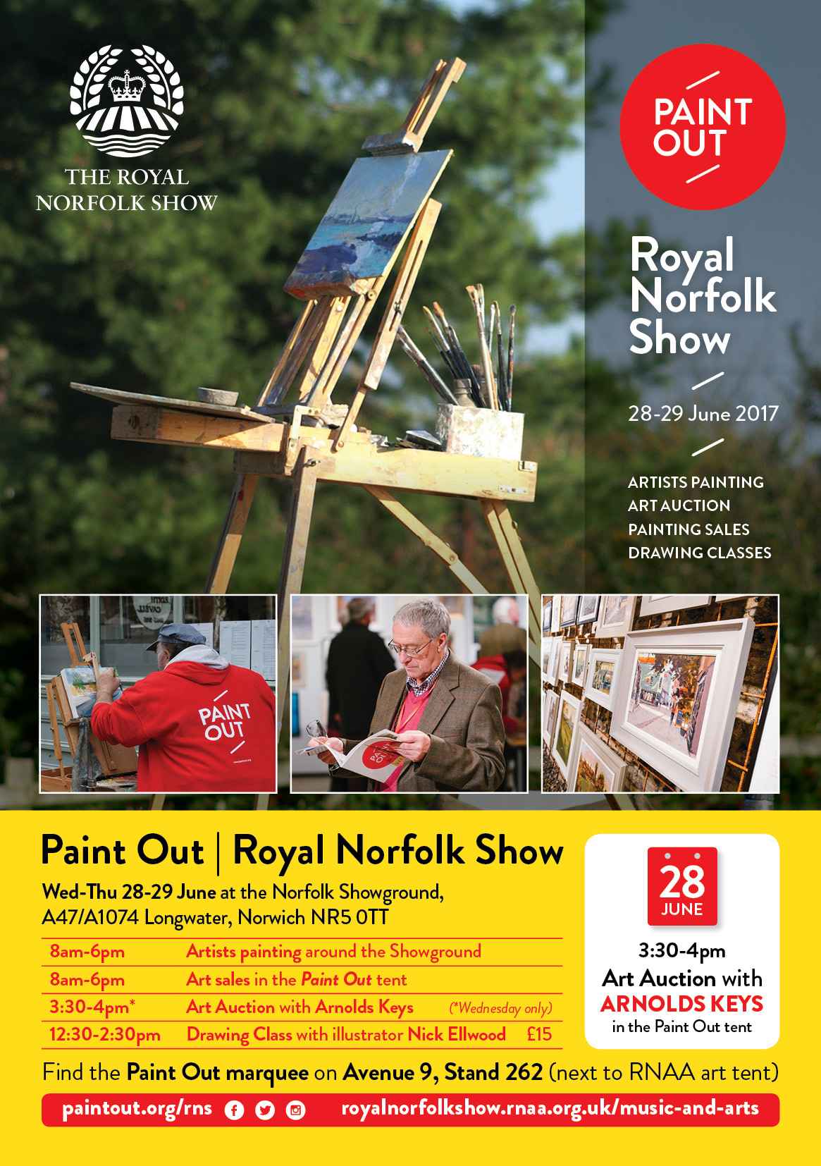 In 2017, Paint Out has been invited to bring its live art experience painting event to the Royal Norfolk Show, 28-29 June. At 3.30pm on Wednesday 28th, Arnolds Keys Auctioneers will be selecting some of the best of the day’s paintings so far to auction off as your first chance to own some fresh-from-the-easel art. Do come and find the Paint Out marquee on Avenue 9, Stand 262 (next to RNAA art tent).
