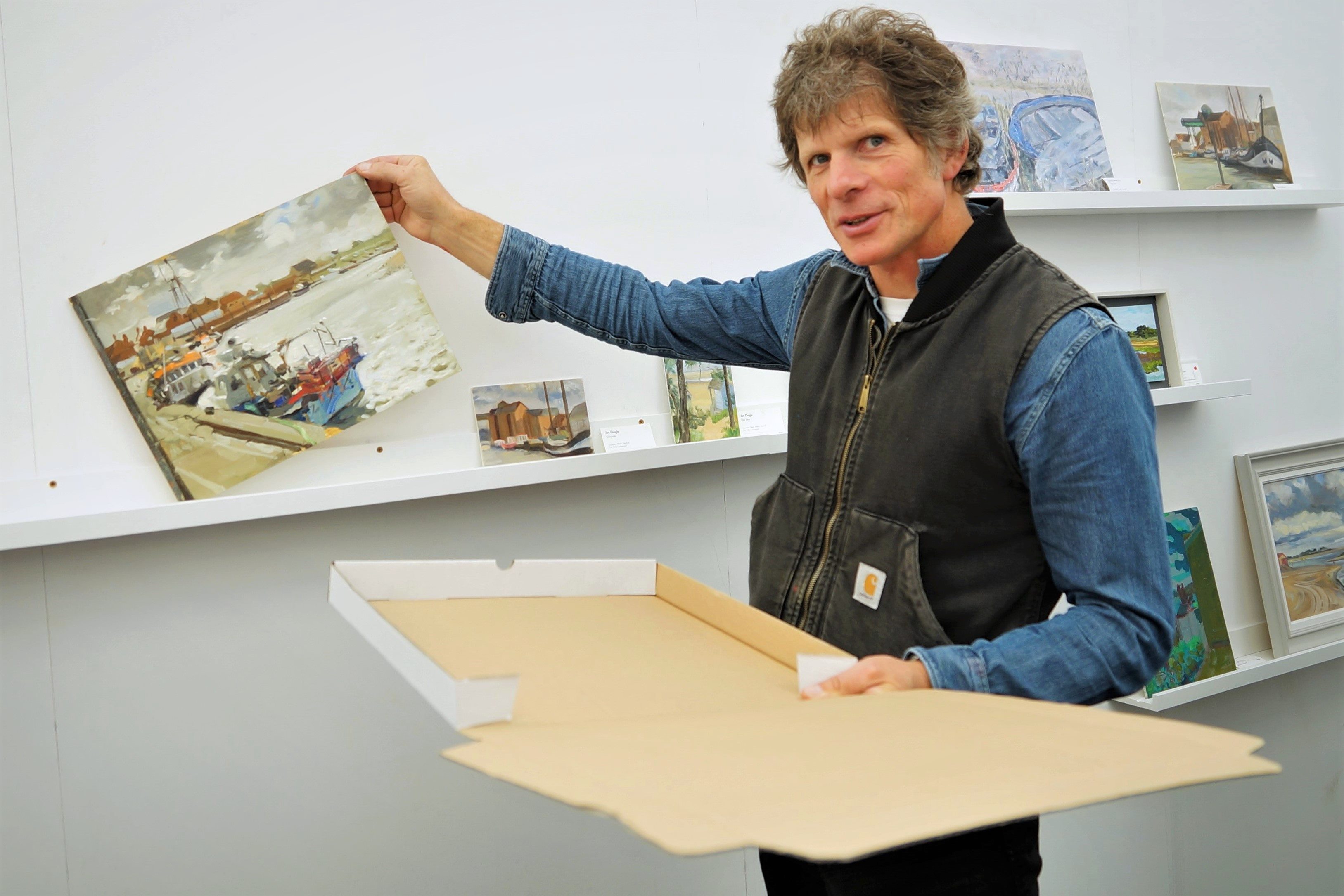 James Colman packages a sold artwork in the posh paintout takeaway pizza box. Photo by Katy Jon Went
