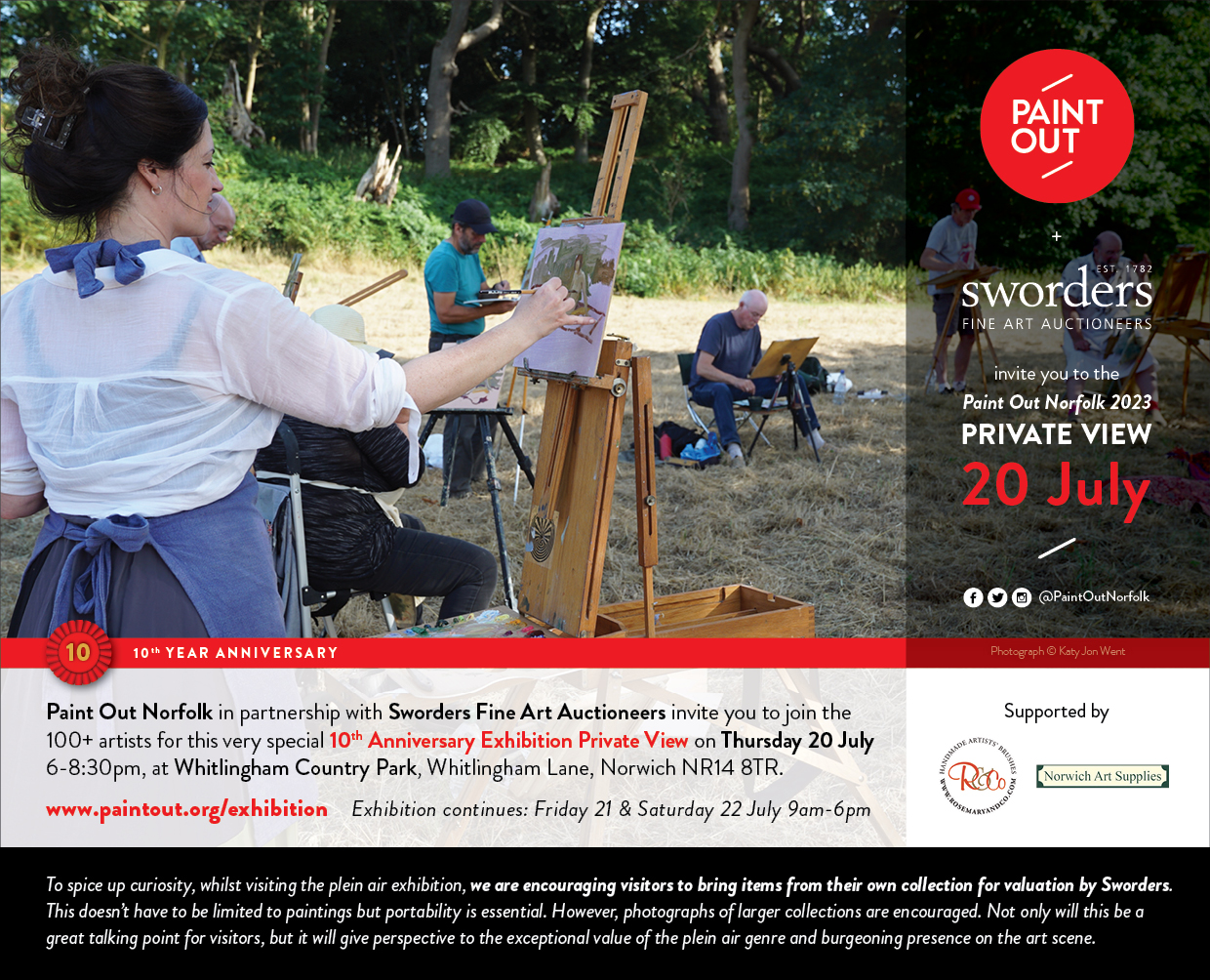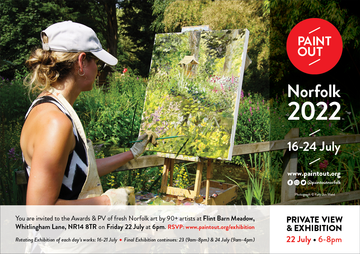 Paint Out Norfolk takes place 13-22 July. 100+ plein air artists touring city and towns, coast and countryside. Eight painting days in the summer sun! The rolling exhibition of around 100 new daily artworks will be on display throughout the week and 300+ on the final day drawn from 800+ created during the full event. The catalogue will be available here later in the event week.