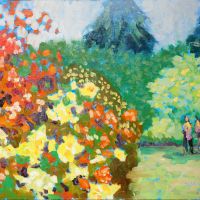 Artist Stephen Johnston, 'Autumn Fireworks among the Dahlias', Houghton Hall Walled Garden, Oil, 20x20in, £350. Paint Out Gardens 2019