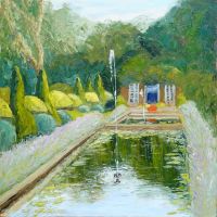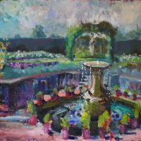 Artist Stephen Johnston, 'Rose and Fountain', Houghton Hall Walled Garden, Oil, 16x20in, £290. Paint Out Gardens 2019