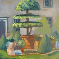 Artist Karen Adams, 'Terracotta and Topiary', Hunworth Hall, Norfolk, Oil, 12x10in, £150. Paint Out Gardens 2019