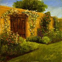 Artist Eleanor Alison, 'Rose Wall', Elsing Hall, Dereham, Norfolk, Oil, 12x12in, £250. Paint Out Gardens 2019