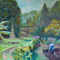 Artist Stephen Johnston, 'Gardening Blues', The Plantation Garden, Norwich, Oil, 16x20in, £350. Paint Out Gardens 2019