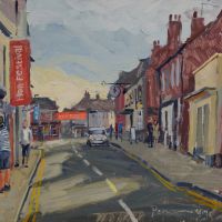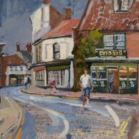 Artist: Emma Perring, Title: Cleaning Windows on the Sunny Side of the Street, Location: High St, Holt, Media: Oil, Size: 30x40cm, SOLD at £340