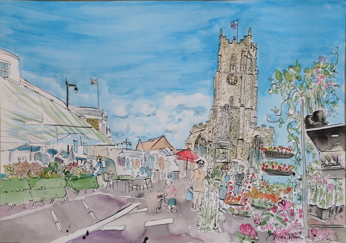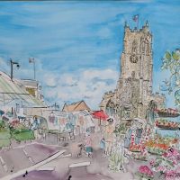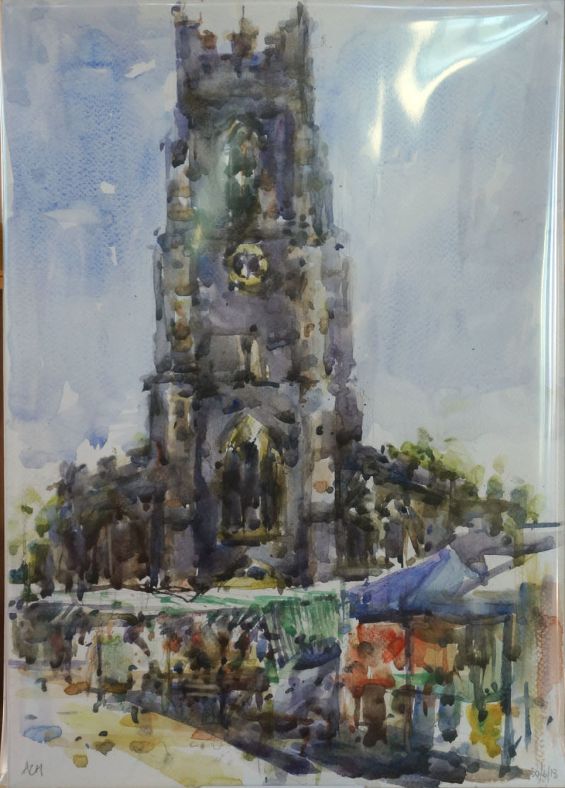 Artist Andrew Horrod, 'St Peter's Church, Market Day', High Street, Sudbury, Watercolour, A3, £150. Paint Out Sudbury 2018