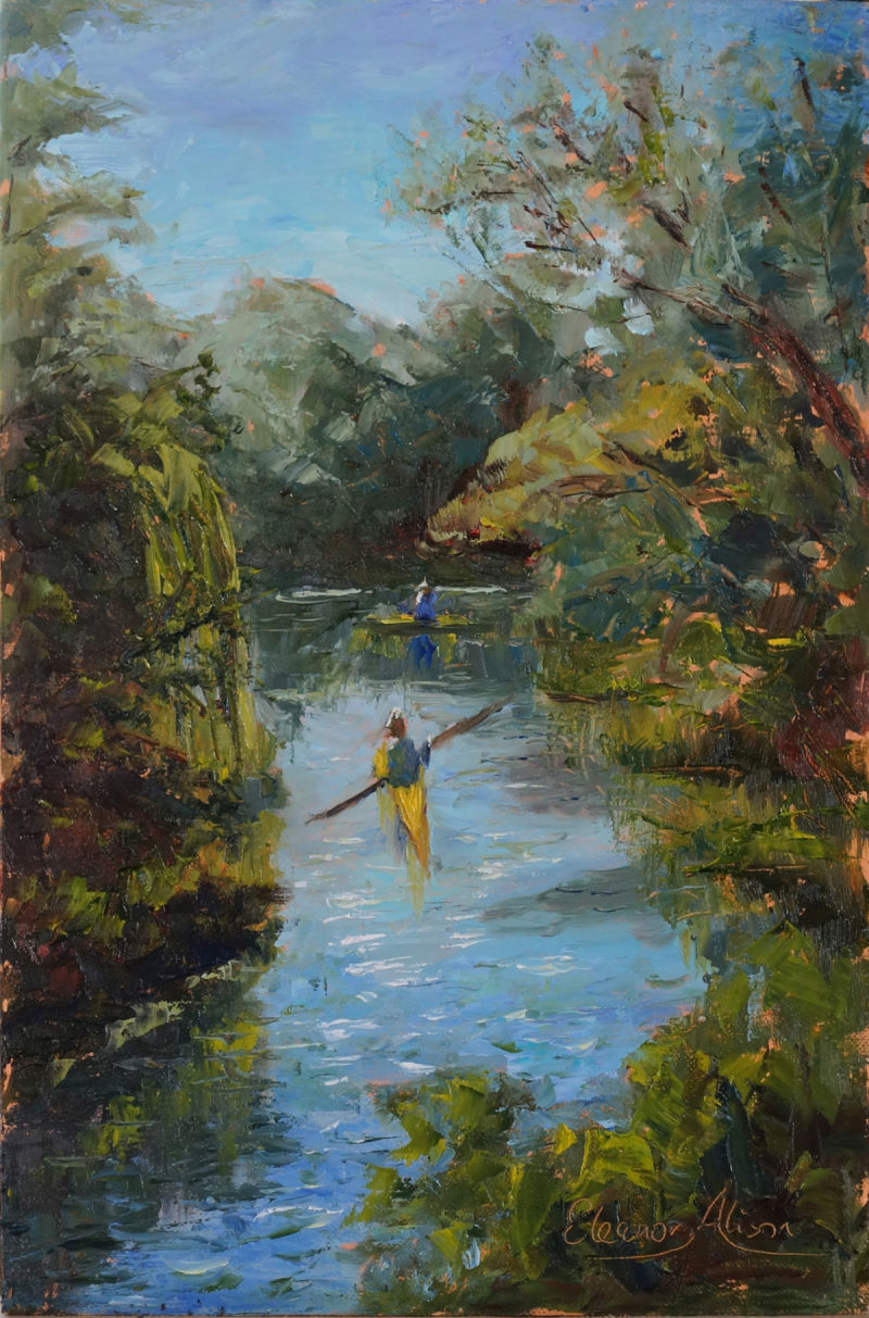 Artist Eleanor Alison, 'Summer Canoeing', River Stour, Sudbury, Oil, 12x9in, £160. Paint Out Sudbury 2018