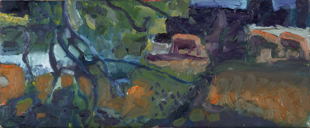 Jack Godfrey, 'Low Key Cows by a River', Under a Tree by Freemans Great Common, Sudbury, Oil, 30x70cm, FOR SALE