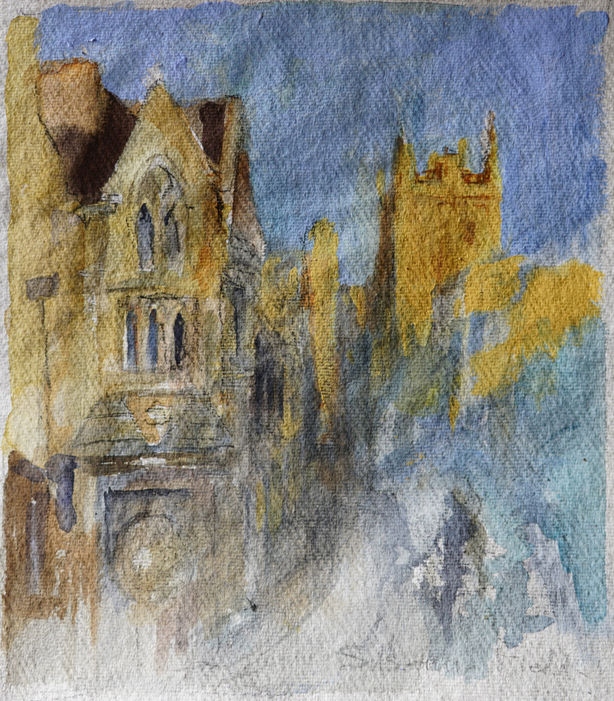 Artist Susanna Field, 'Not Quite a Nocturne - King's', King's Parade, Mixed Media, 23x21cm, £100. Paint Out Cambridge 2019. First Prize in Watercolour & Mixed Media