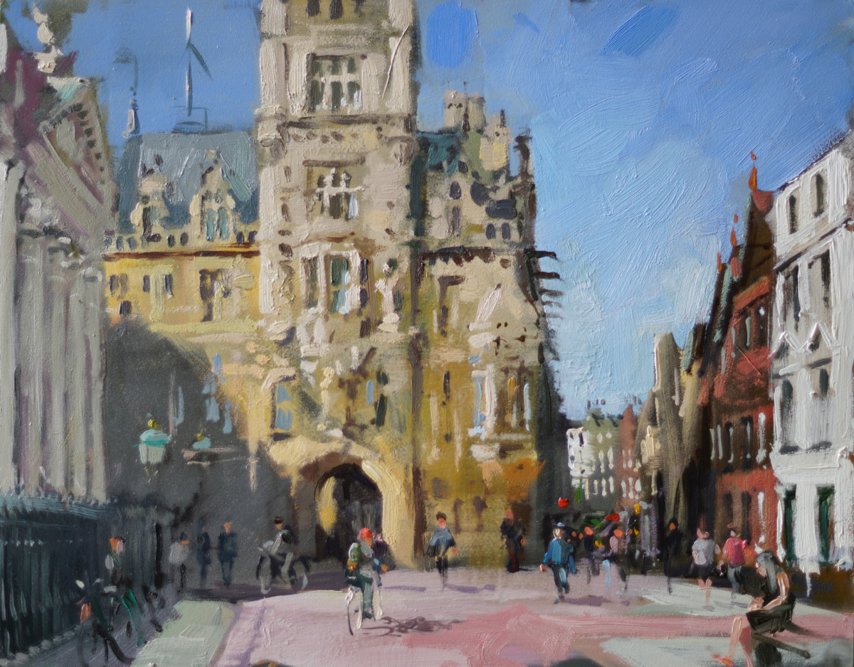 Artist Sarah Allbrook painting plein air, February sunshine on King’s Parade, Cambridge