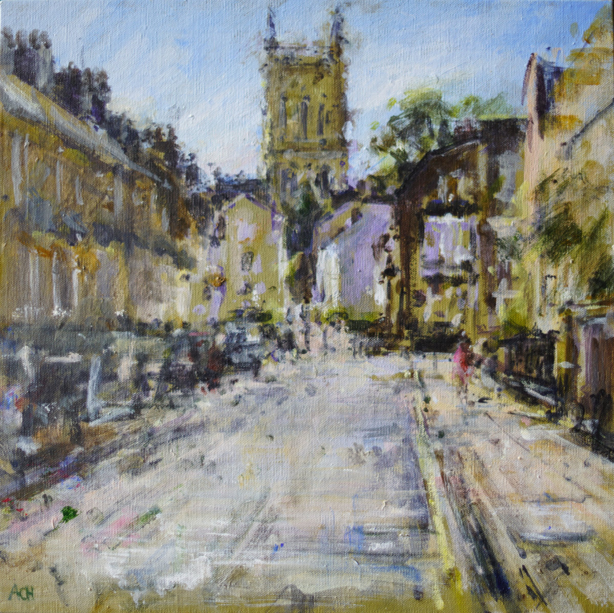 Artist Emma Perring, 'Cleaning Windows on the Sunny Side of the Street', High St, Holt, Oil, 30x40cm, SOLD at £340. Paint Out Holt 2019 Spirit of Holt Winner