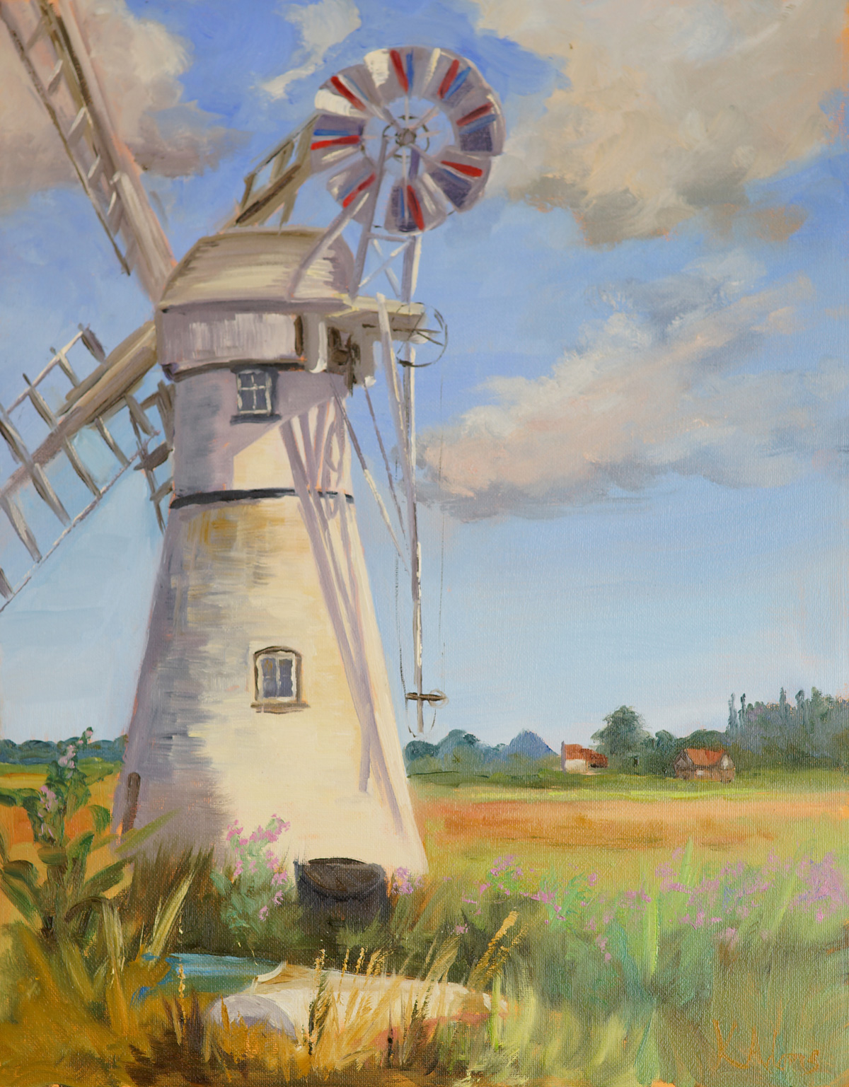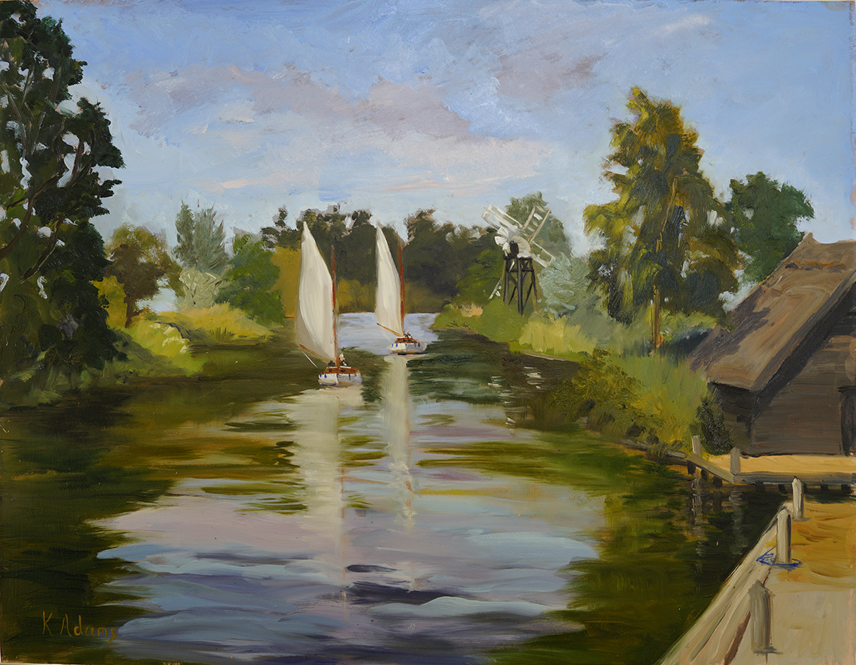 Karen Adams works in large and small scale having exhibited in The Brancaster Staithe Midsummer Exhibition and painted murals for the Brancaster Staithe Sailing Club’s Annual Summer Ball. Her preferred medium is oil painting in which she paints a variety of landscapes but particularly enjoys painting beaches – where she initially encountered and participated in Paint Out Wells first beach sunrise ‘paint out’ in 2015 – marshes and boats in Norfolk, and street scenes. She now travels to paint and continues to grow in consistency and quality securing her first Paint Out prizes in 2017 & 2018.