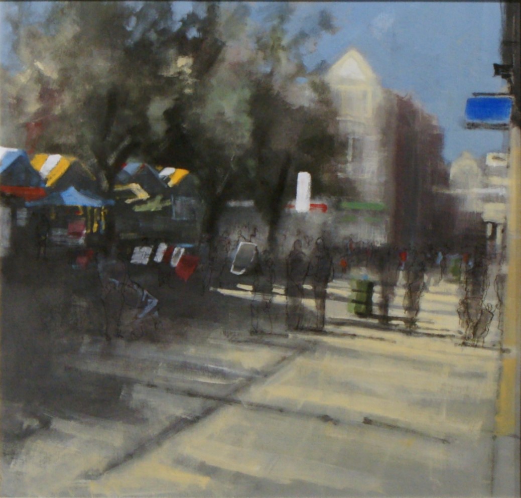 DSC01263 Artist Tom Cringle 'Blue Sign, Market', Norwich Market, £375 Acrylic & ink, 50x50cm, Paint Out Norwich 2016 - Mixed Media Second Prize. Photo by Katy Jon Went