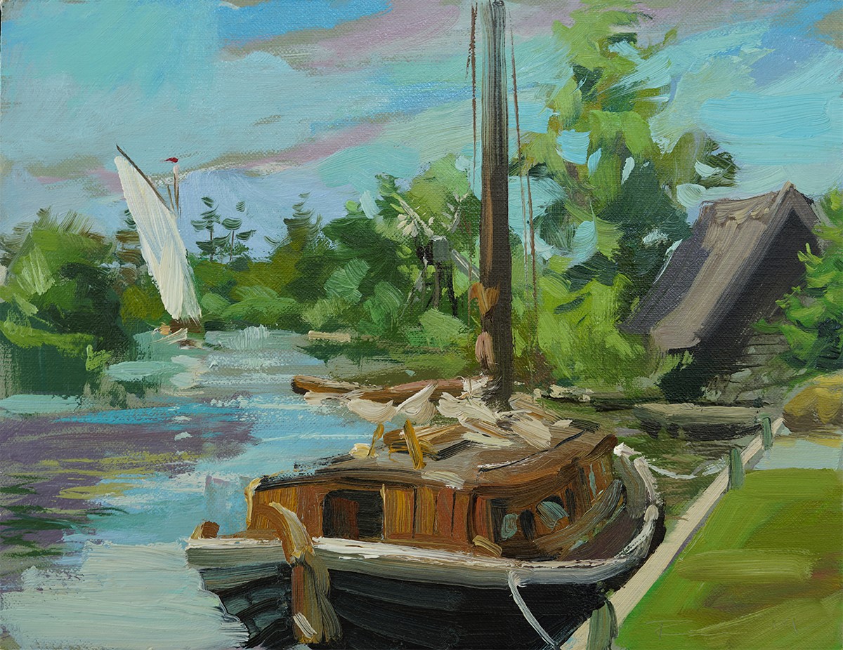 Paint Out Ludham took place 26 June. Ten plein air artists explored a quintessential Broads village with thatch, boats, lanes, classic cars and wherries, and 16 open gardens. It was also an opportunity to support Norfolk heritage and historic church preservation as we were based at St Catherine’s Church, built on an 11th-century site. This was the place where the artist Edward Seago chose to live in his Grade II listed Dutch House. Across his life, he painted from Italy to Morocco, Anglesey to Portugal, the Second World War to the Coronation, but Norfolk was his love from Ludham to Great Yarmouth and more local sites. Kieron Williamson, the teenage artist known as the “mini Monet”, was inspired by this area of Norfolk. He still lives and paints locally in Ludham.