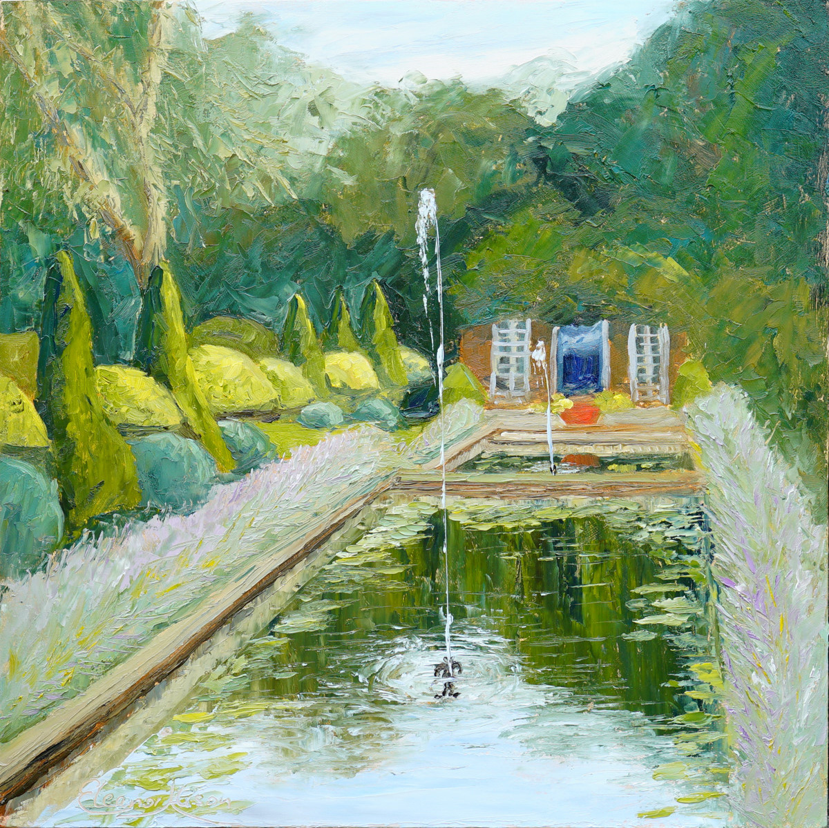 Artist Wendy Kimberley, 'Reflections', Elsing Hall, Dereham, Norfolk, Acrylic, 50x50cm, £350. Paint Out Gardens 2019