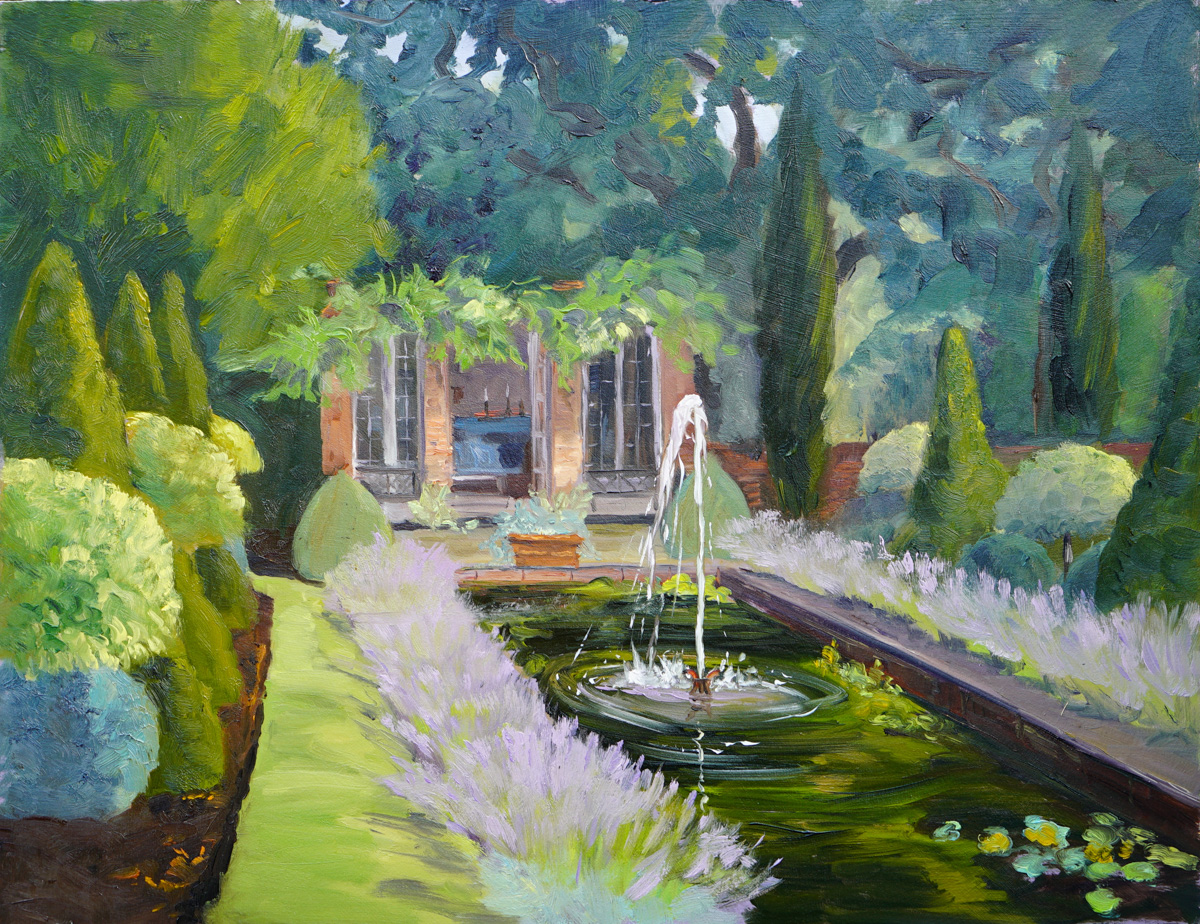 Artist Stephen Johnston, 'Rose and Fountain', Houghton Hall Walled Garden, Oil, 16x20in, £290. Paint Out Gardens 2019
