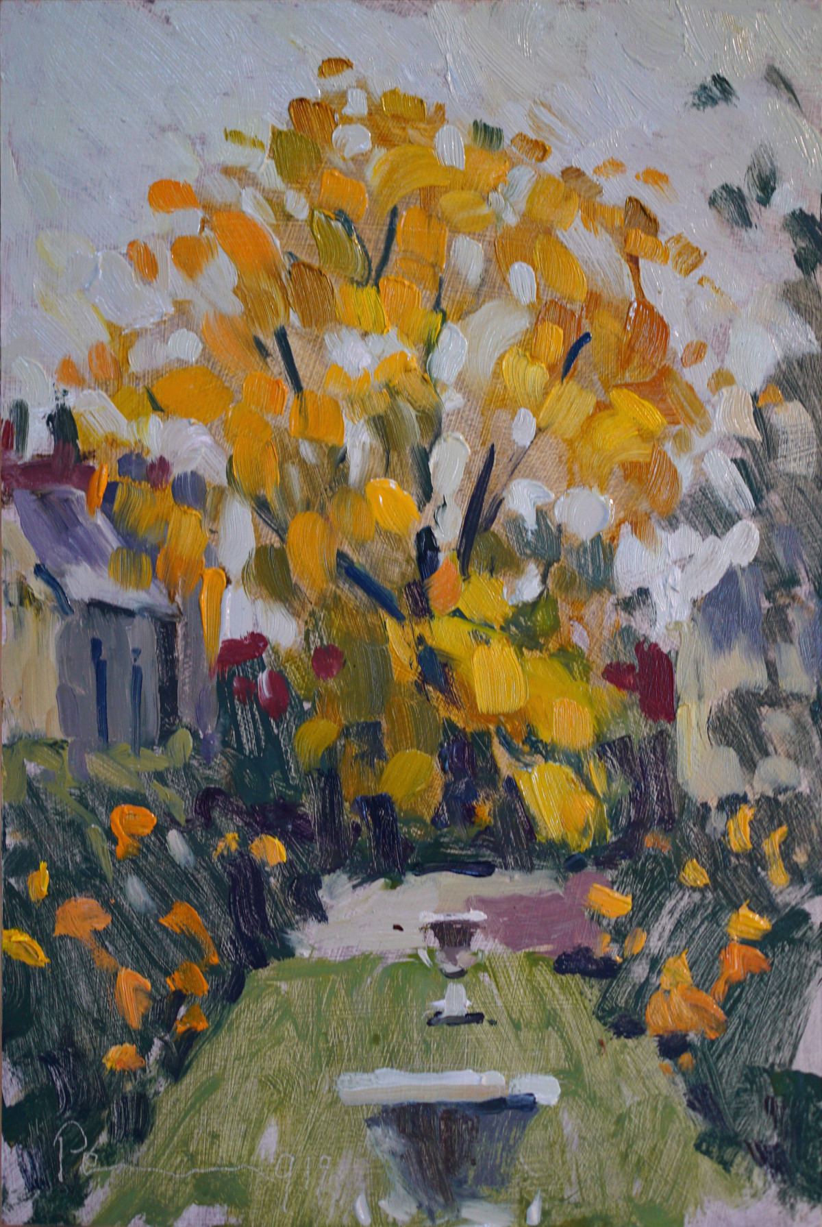 Artist Stephen Johnston, 'Ochre Fall', Bishop's House Gardens, Norwich, Oil, 16x20in, £350. Paint Out Gardens 2019