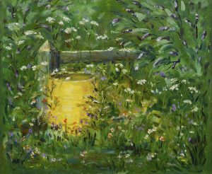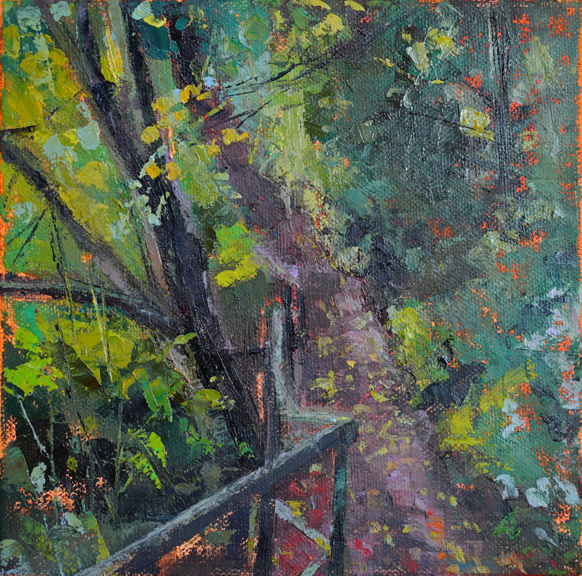 Artist Sam Robbins, 'Fairy Path', The Plantation Garden, Norwich, Oil, 8x8in, £280. Paint Out Gardens 2019