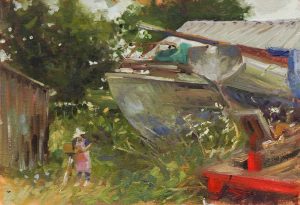 Artist Dave West, Decayed, Trowse boatyard, Oil, 25x30cm, £375