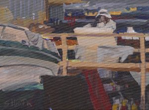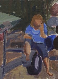 Artist Naomi Clements Wright, The fishing lesson, Whitlingham, Oil, , £320. Paint Out Norfolk 2020