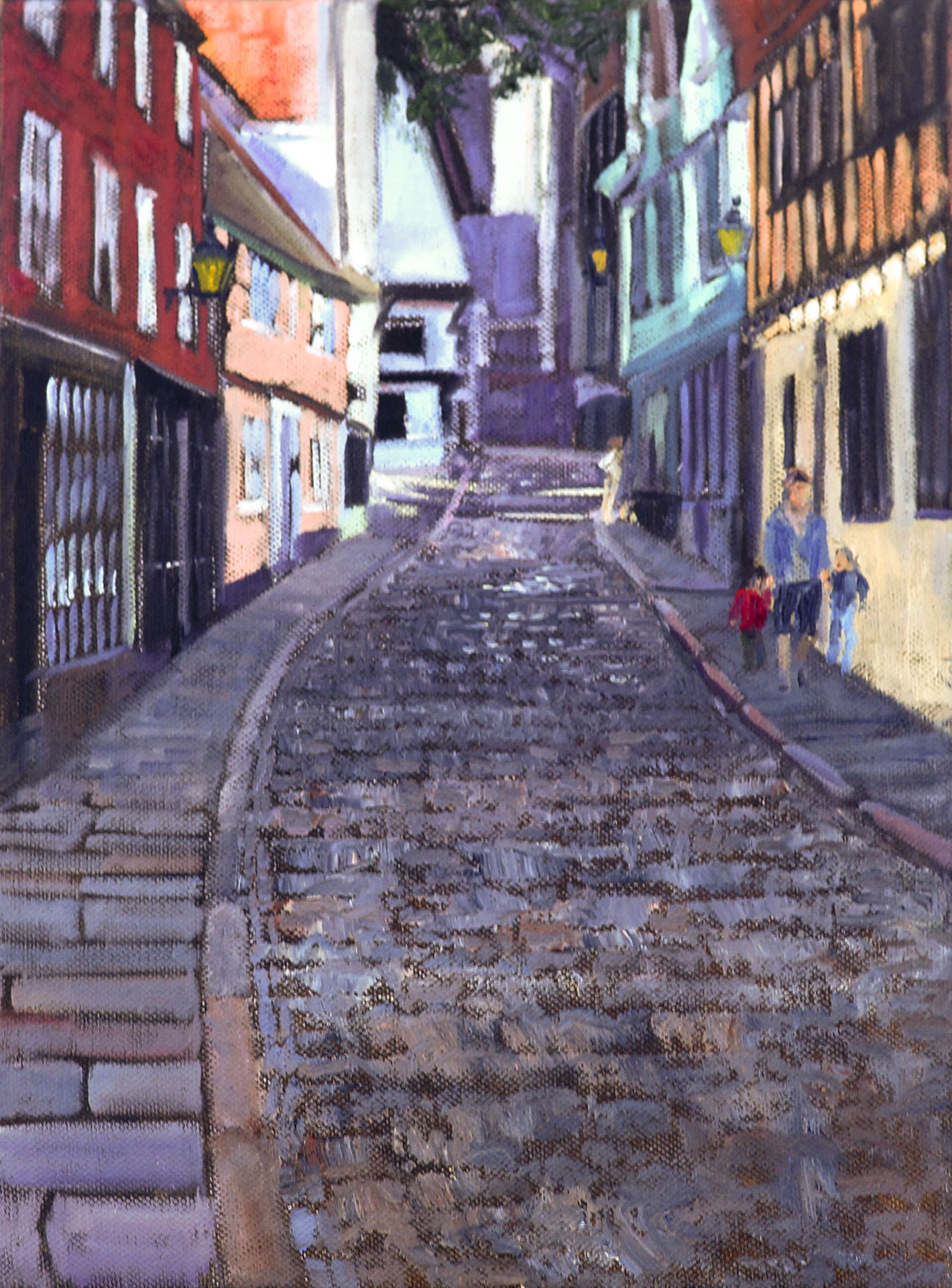 Artist Karen Adams, Rosy Glow on Elm Hill, Norwich, Oil, 30x20cm, £230