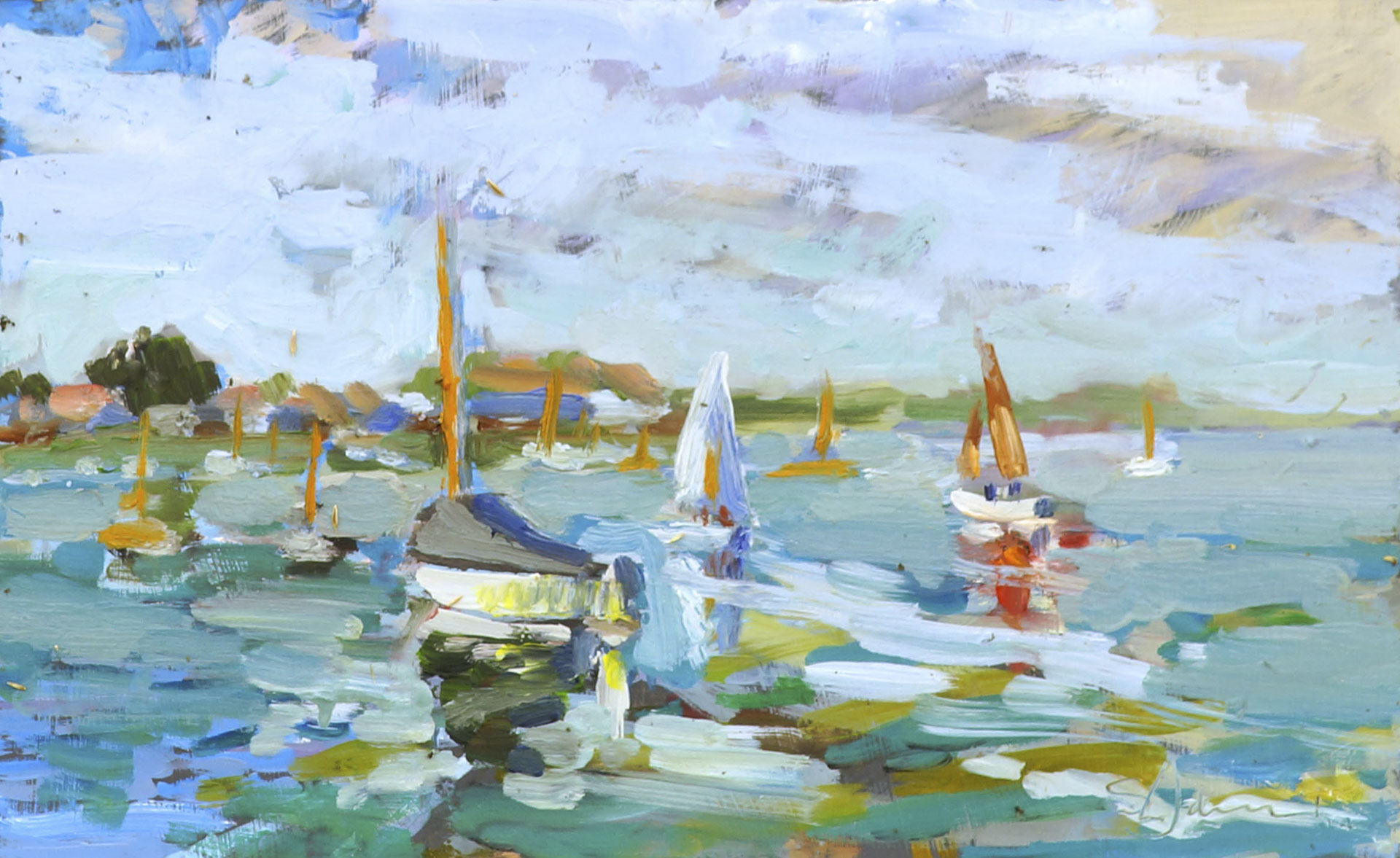 Artist Tushar Sabale, Red Sail on a High Tide!, Burnham Overy Staithe, Norfolk, Oil, 12x16in, £650. Paint Out Norfolk 2022