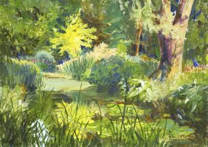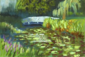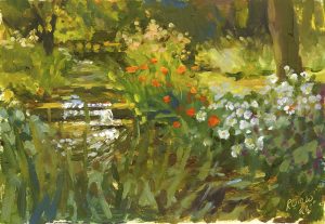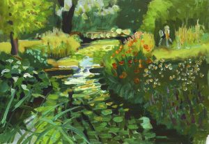 Artist Shirley Shakespear, Monet not, Gooderstone Water Gardens, Norfolk, Acrylic, 12x16in, £100. Paint Out Norfolk 2022