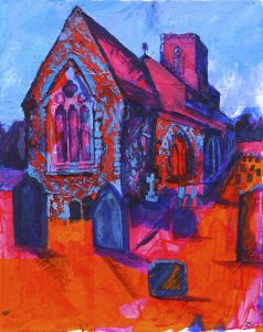 Artist Susan Isaac, St Mary’s Church, Surlingham, Mixed Media, 40x50cm, £490. Paint Out Norfolk 2020