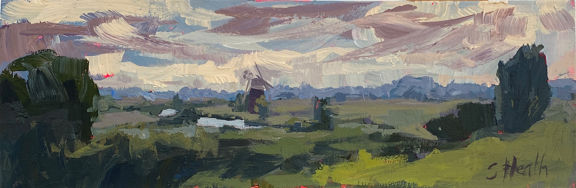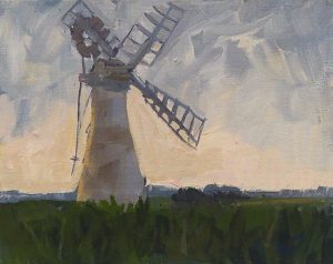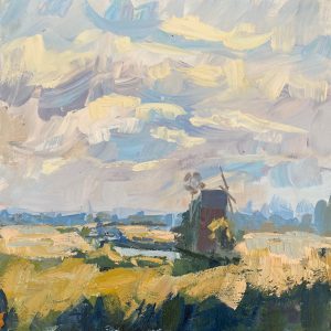 Artist Tushar Sabale, Evening Sun Behind the Windmill, Burnham, Norfolk, Oil, 9x12in, £350.