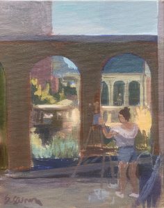 Artist Eleanor Alison painting plein air at Paint Out Elsing Hall Gardens, Norfolk