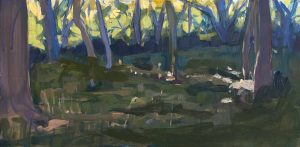 Artist Jack Godfrey, 'Woods in Blue', Elsing Hall, Dereham, Norfolk, Acrylic, 8x10in, £140. Paint Out Gardens 2019