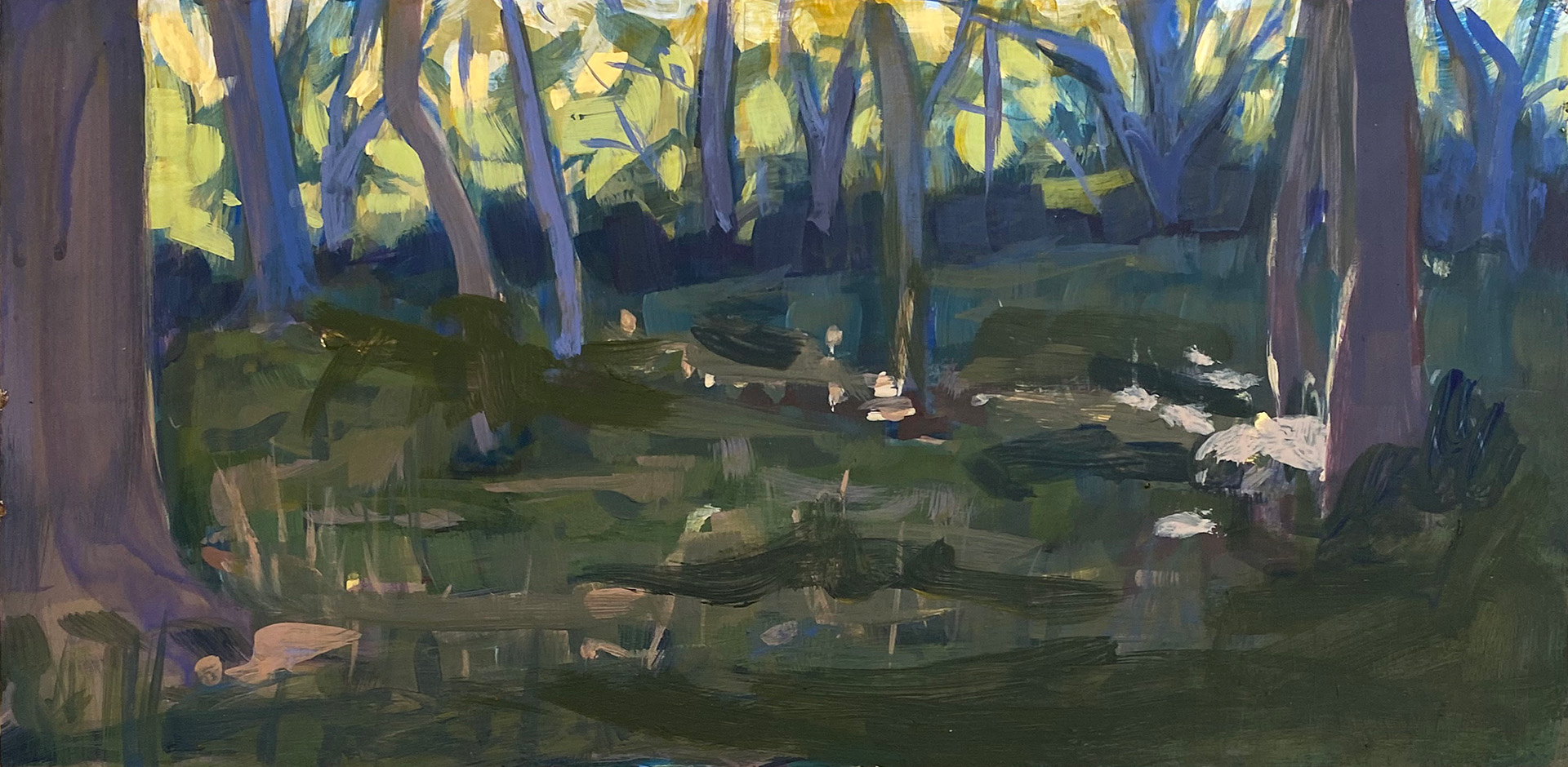 Artist Mindy Qin, Gooderstone Water Gardens, Norfolk, Oil, 10x12in, £200. Paint Out Norfolk 2022